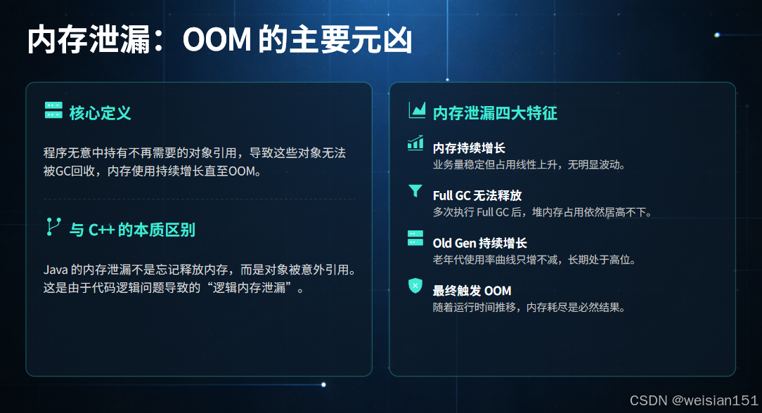 | 内存泄漏(Memory Leak) | 无用对象(不再被业务使用)被强引用持有,无法被GC回收,持续占用内存 | 内存使用率持续攀升,无明显下降,最终引发OOM | 否(强引用未释放,GC无法标记为垃圾) | 约70%(生产环境OOM主因) |