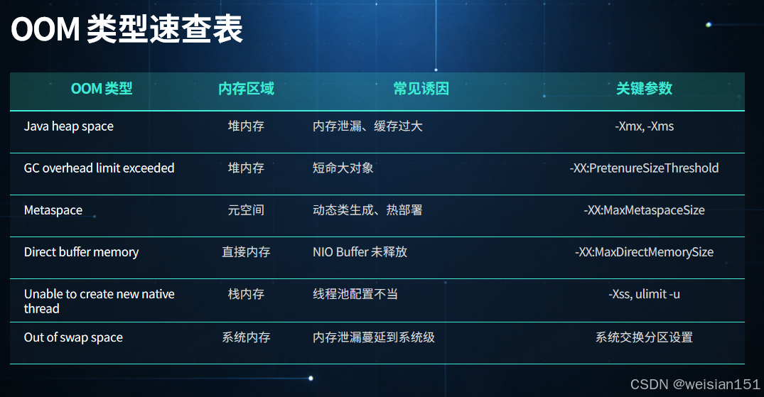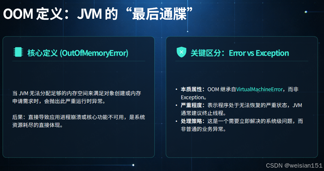 观点输出:OOM 不是简单的"内存不够",而是 JVM 在资源枯竭时抛出的最严重错误。读懂 OOM,是 Java 高手的必修课。