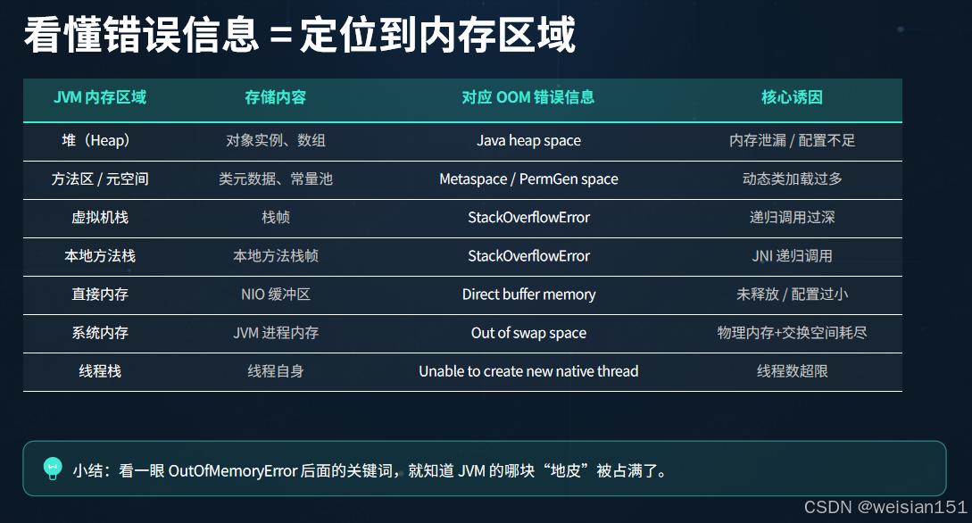 核心逻辑:不同内存区域耗尽,抛出不同的 OOM 错误信息。看懂错误信息 = 定位到内存区域。