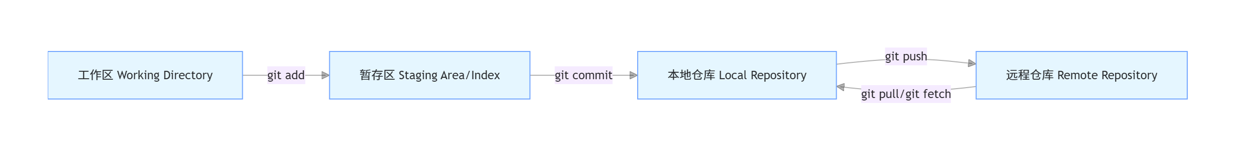 4、远程仓库:托管在服务器上的仓库(如 GitHub/GitLab/Gitee),用于多人协作同步代码