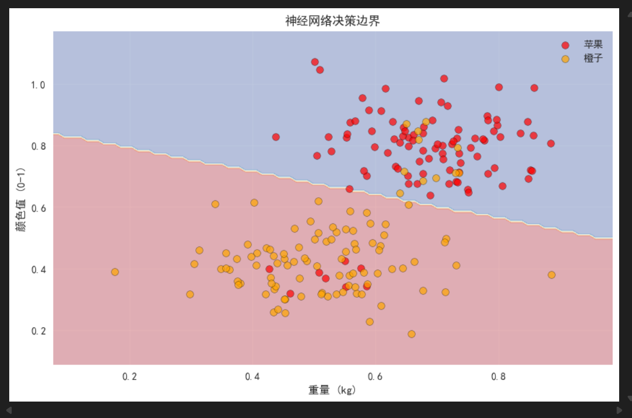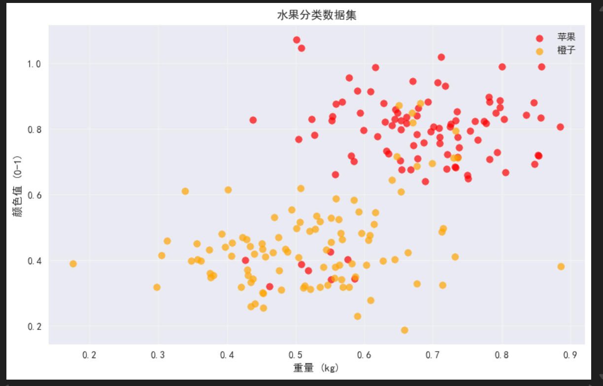 我们将生成一个简单的二分类数据集,模拟水果分类问题:根据重量和颜色值判断是否为苹果。数据分布是非线性的,线性模型无法完美分离。