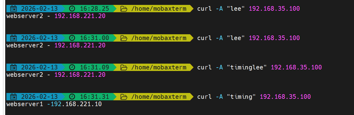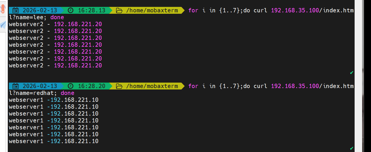 新开一个shell测试,由于hehe的权重高于haha,所以webserver2的访问次数比webserver1多