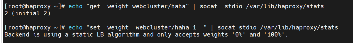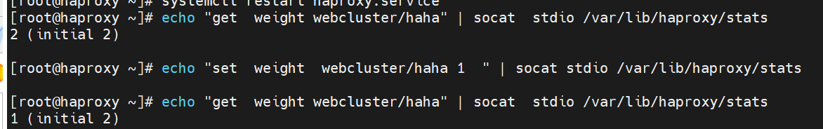 [root@haproxy ~]# echo "set weight webcluster/haha 2 " | socat stdio /var/lib/haproxy/stats