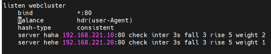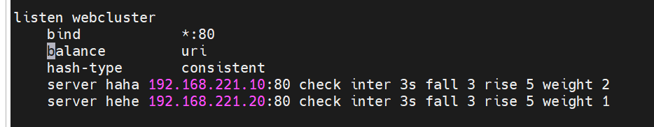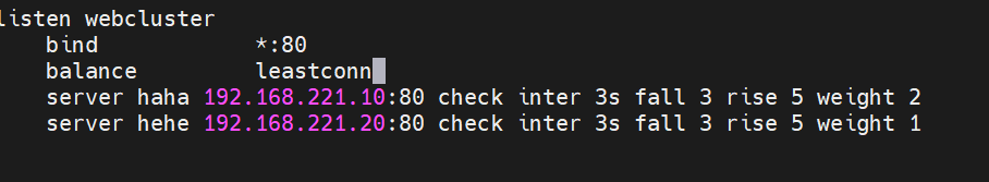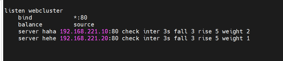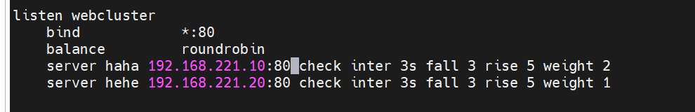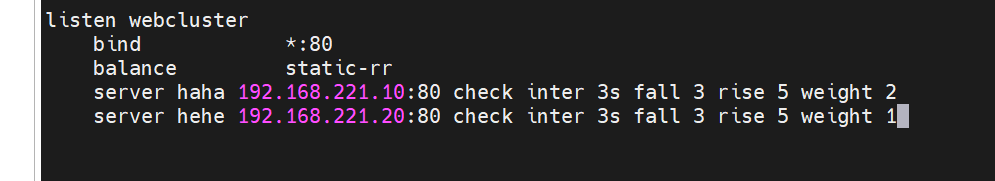server hehe 192.168.221.20:80 check inter 3s fall 3 rise 5 weight 1