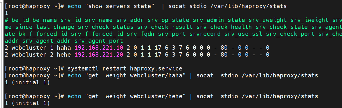 [root@haproxy ~]# echo "set weight webcluster/haha 1 " | socat stdio /var/lib/haproxy/stats