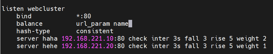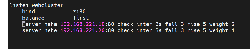 server hehe 192.168.221.10:80 check inter 3s fall 3 rise 5 weight 2