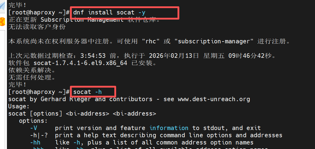 [root@haproxy ~]# socat -h #查看socat帮助手册(能查看到即安装成功)