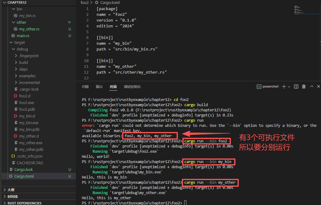 在Cargo.toml文件中要加[[bin]]内容,这个很重要,否则生成不了其它两个子文件: