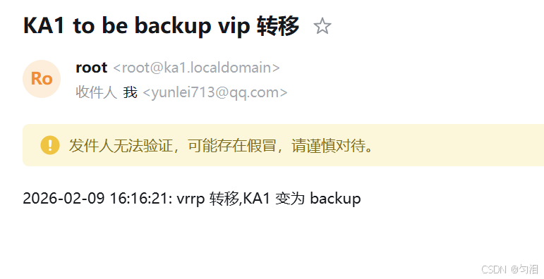 notify_master/notify_backup/notify_fault参数,关联告警脚本,重启服务后验证 VIP 迁移时邮件告警的触发效果。