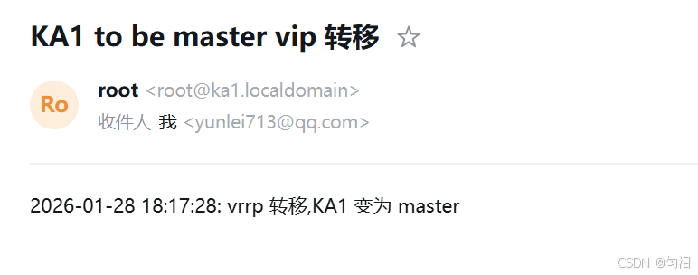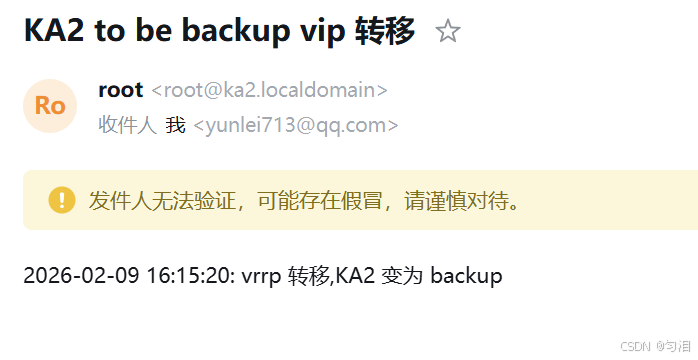 waring.sh脚本,根据 VIP 迁移状态(master/backup/fault)发送不同主题的告警邮件; - 集成到 Keepalived :在配置文件中添加