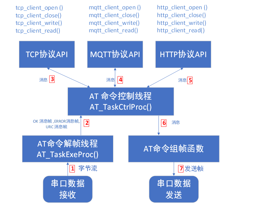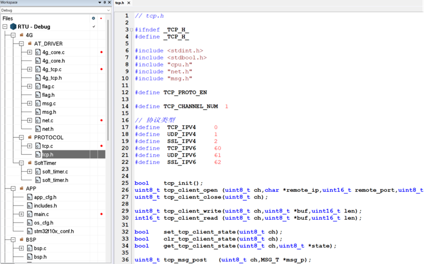 如果支持TCP协议,则对外提供tcp.h,里面包含tcp协议相关的函数供用户层调用,如果提供MQTT协议支持,则对外提供mqtt.h,里面包含mqtt协议相关的函数供用户层调用。