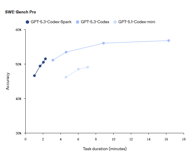 Codex-Spark是一款高性能的小型模型,专为快速推理优化。在评估智能体软件工程能力的SWE-Bench Pro和Terminal-Bench 2.0两项基准测试中,GPT-5.3-Codex-Spark展现出强劲性能,同时完成任务所需时间仅为GPT-5.3-Codex的一小部分。