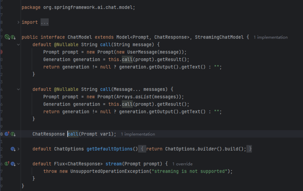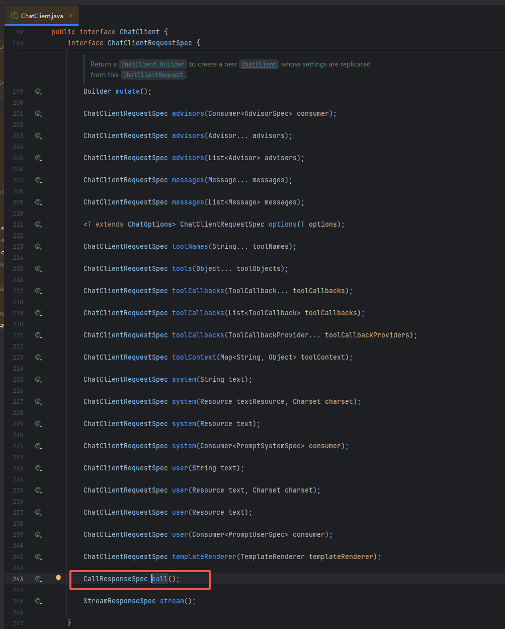 call方法属于ChatClient的ChatClientRequestSpec接口,返回类型为CallResponseSpec
