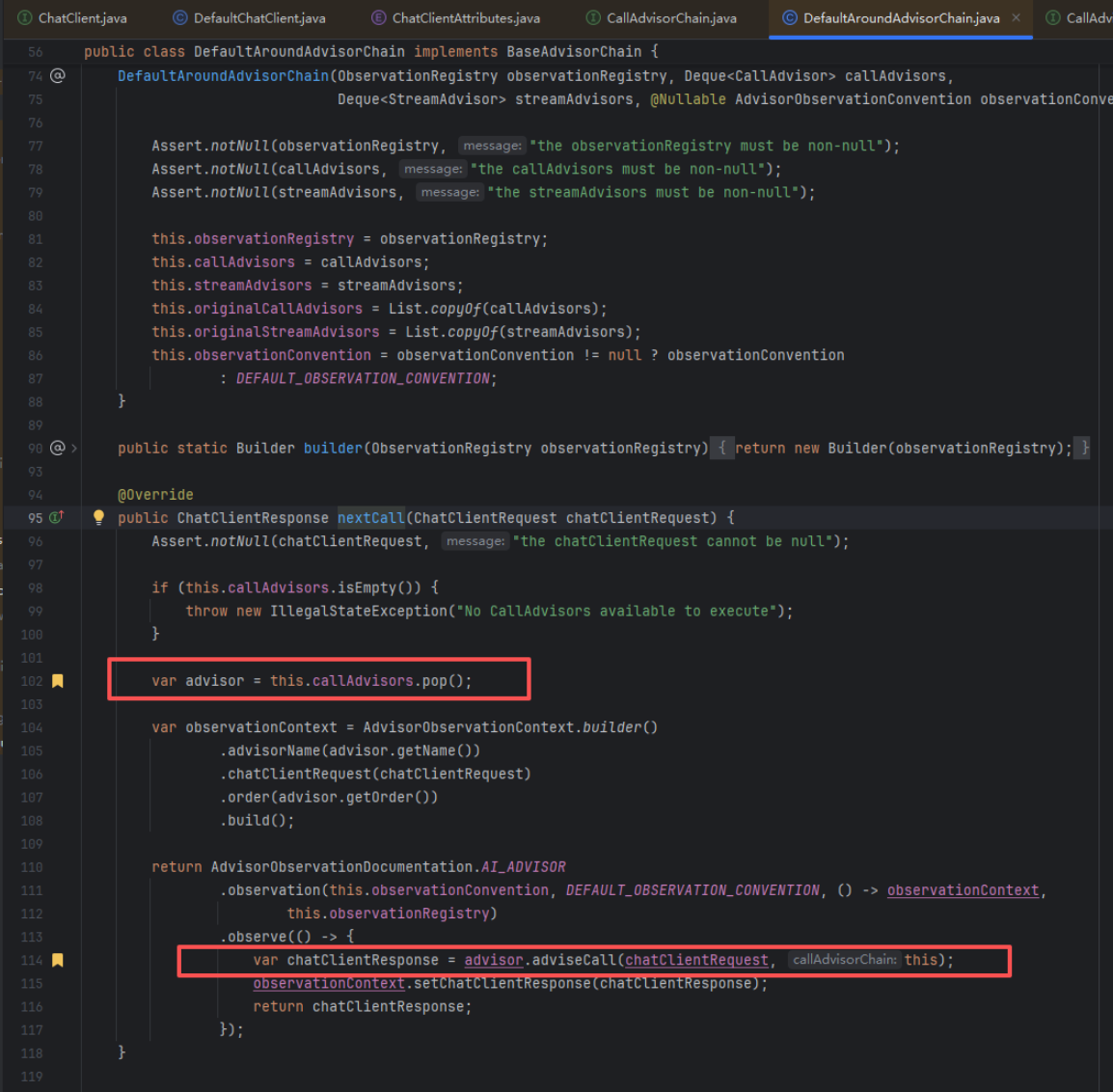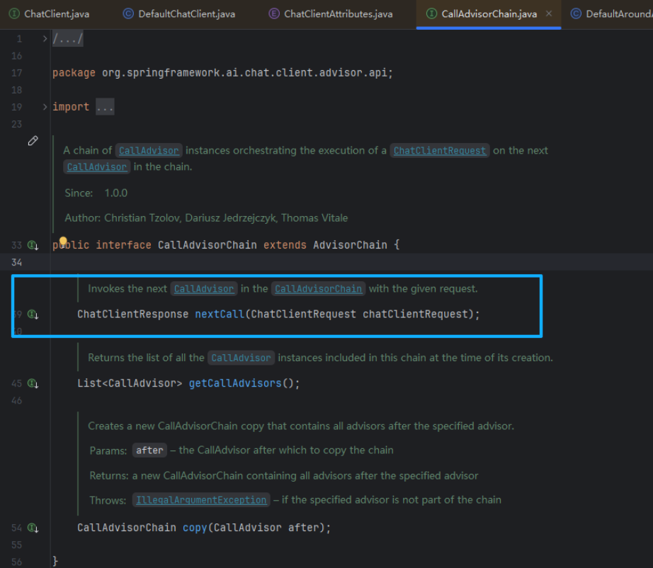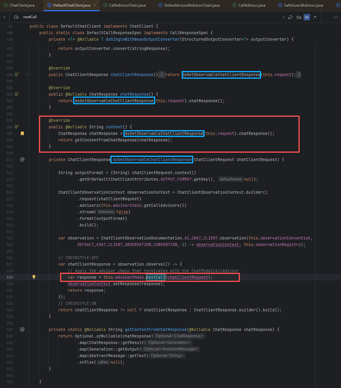 .content为例,最后会调用doGetObservableChatClientResponse,然后再经过一些可观测的相关设置,就会进入nextCall的调用,此时就会根据advisorChain的这个链条来进行调用,类似于 AOP 的拦截器链(Advisor Chain)设计模式。
