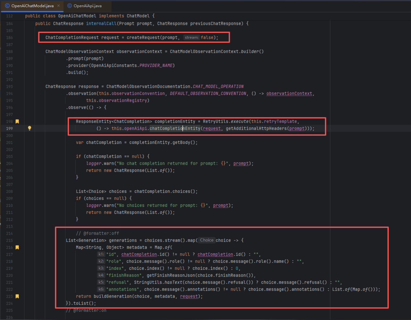 createRequest: 创建请求体this.openAiApi.chatCompletionEntity: 发送请求- 对于返回的对象进行判空验证