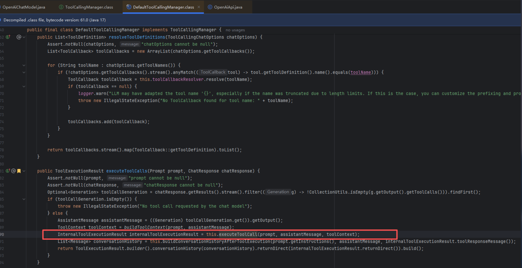 InternalToolExecutionResult internalResult = this.executeToolCall(prompt, assistantMessage, toolContext);