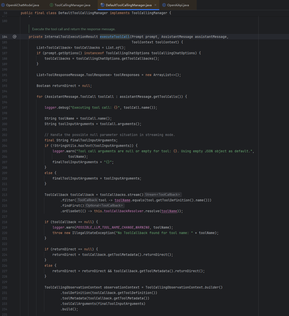 private InternalToolExecutionResult executeToolCall(Prompt prompt, AssistantMessage assistantMessage, ToolContext toolContext) {