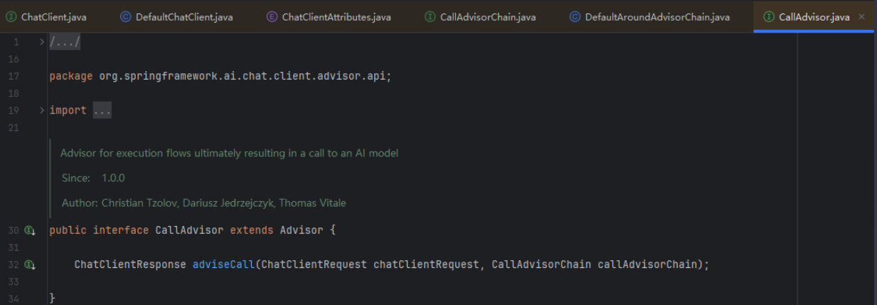 ChatModelCallAdvisor。它在链的最末端,负责真正调用 LLM(如 OpenAI, Ollama)。 -