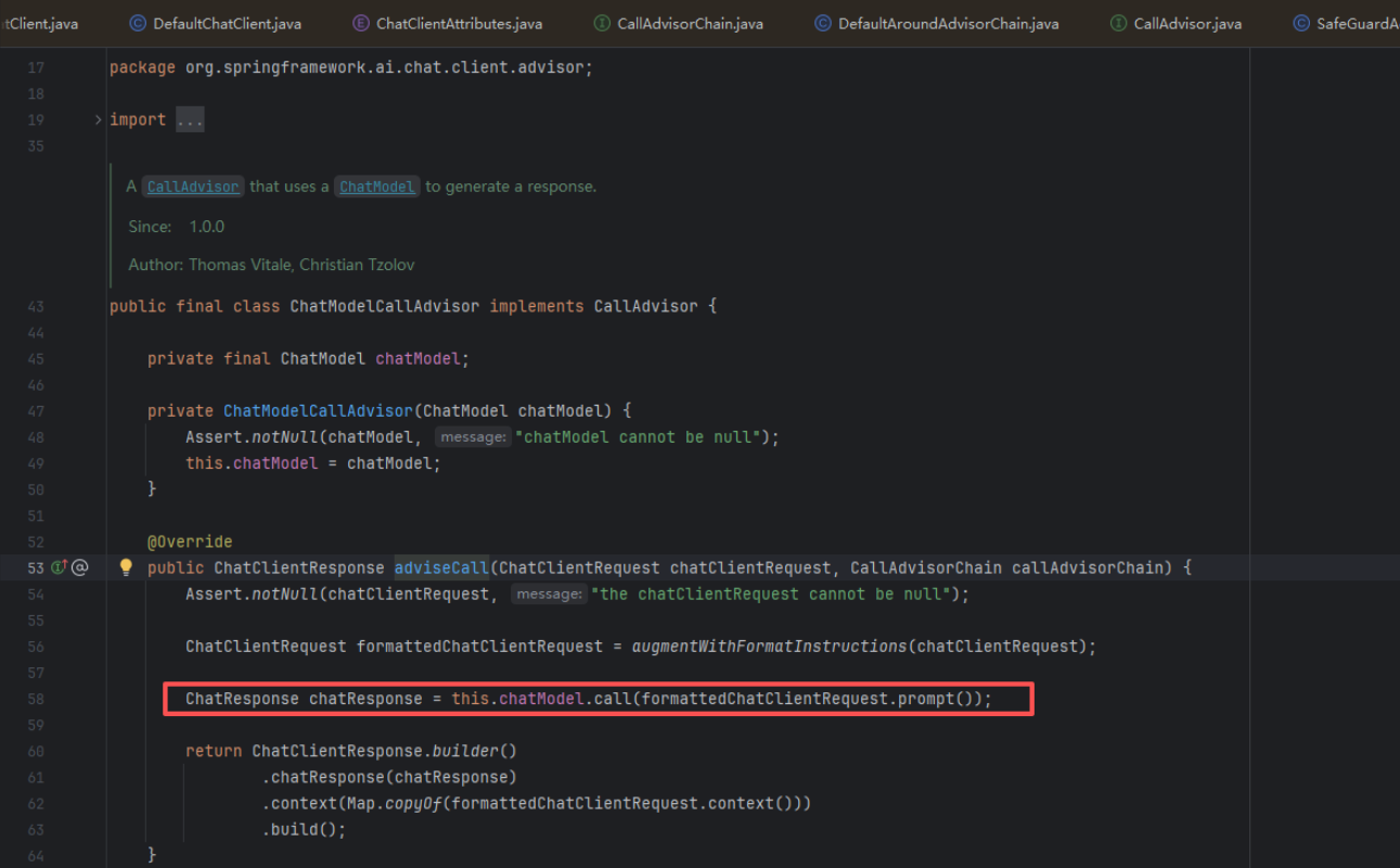 this.advisors.add(ChatModelCallAdvisor.builder().chatModel(this.chatModel).build());
