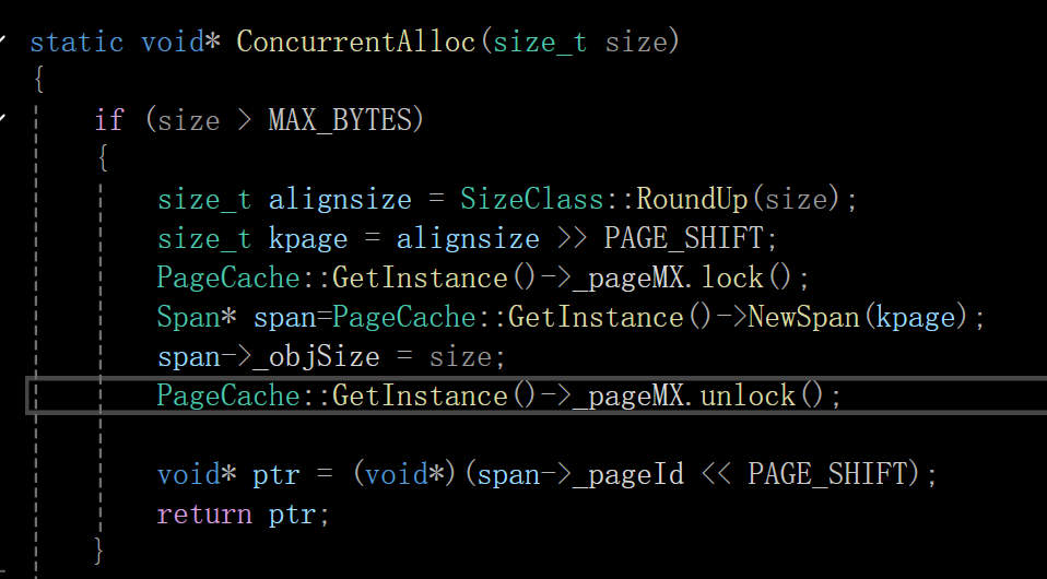 如果我们一次性开辟小于256k,则直接走这三个cache就行,那要是大于呢?我们要对这种情况进行代码编写和处理: