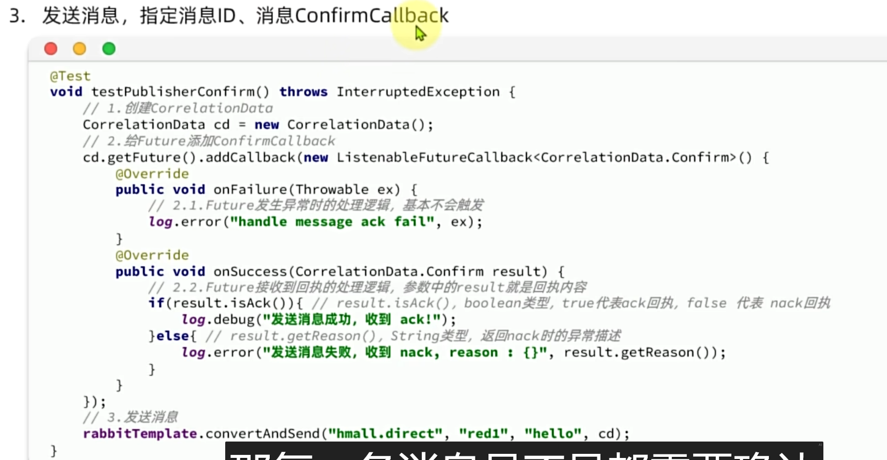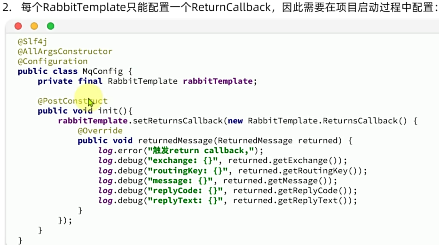 我们需要在配置类中定义ReturnCallback,并在发送消息时绑定ConfirmCallback。
