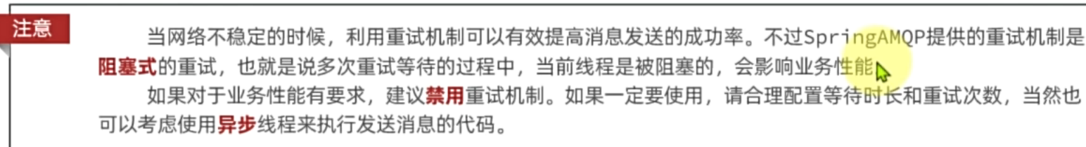 当消费者处理消息异常时,如果立即将消息退回队列,可能形成死循环(反复消费-失败-退回)。Spring提供了本地重试机制。