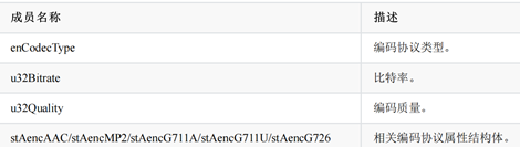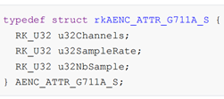4.stAencAAC 、 stAencMp2 、 stAencG711A 、 stAencG711U 、 stAencG726 : 这几个结构体是不同的音频编码器的专门协议属性结构体