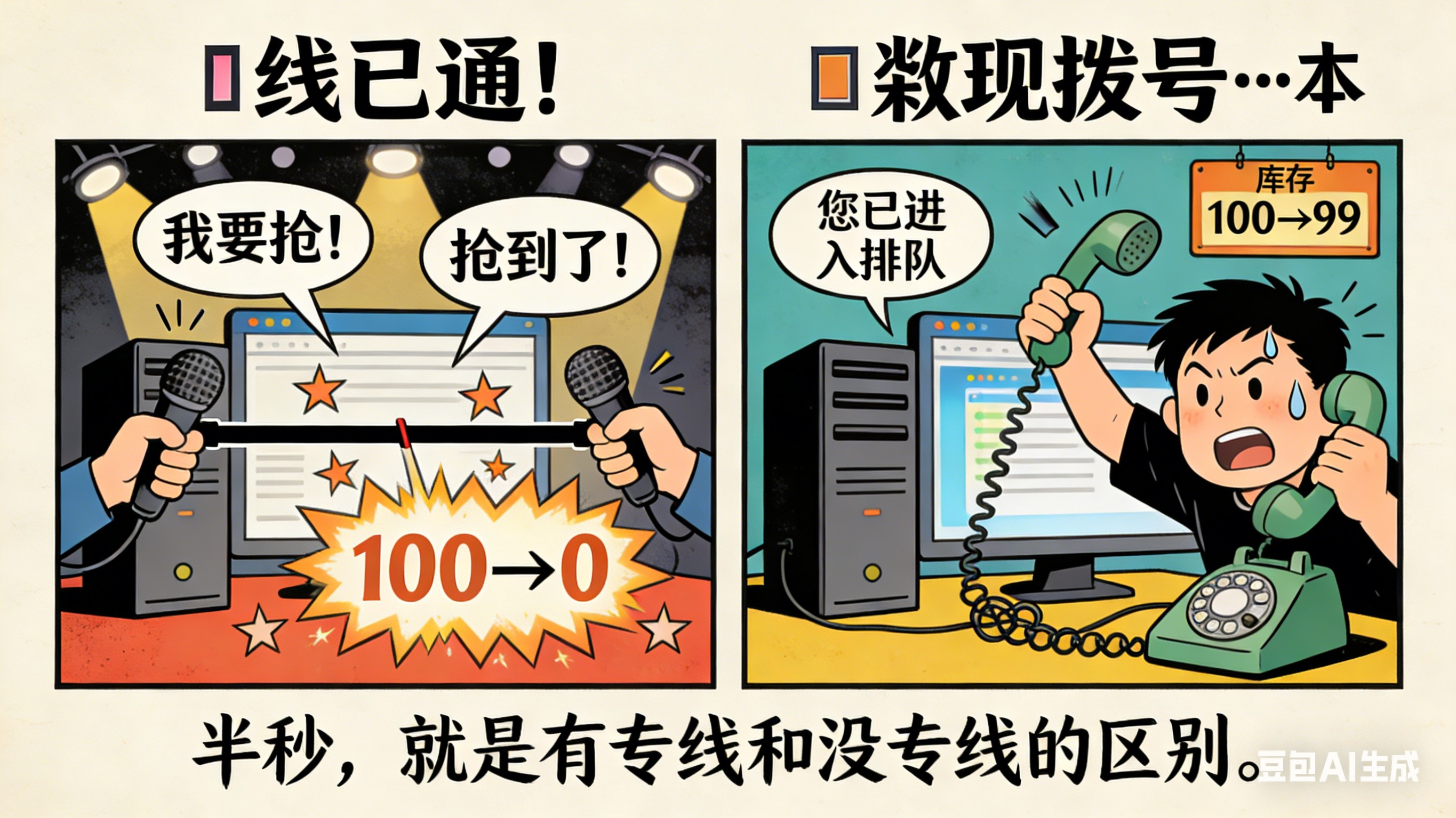 秒杀场景里,半秒足够让库存从 100 变 0。