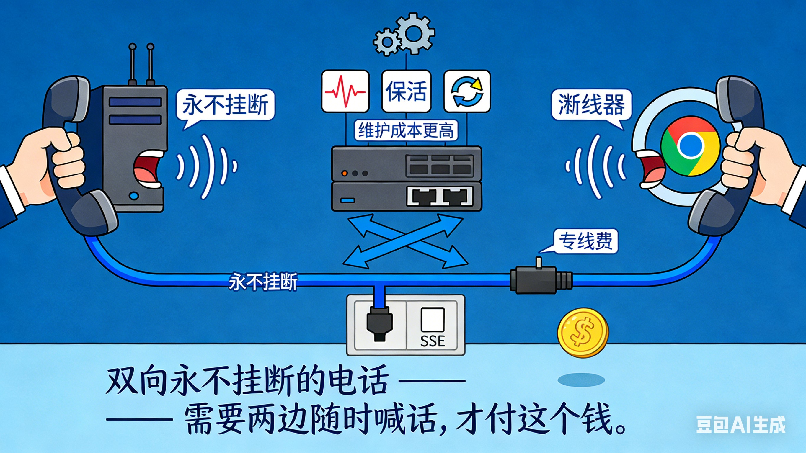 双向随时说话意味着双向解析、心跳保活、断线重连,服务器维护成本比 SSE 高出一截。
