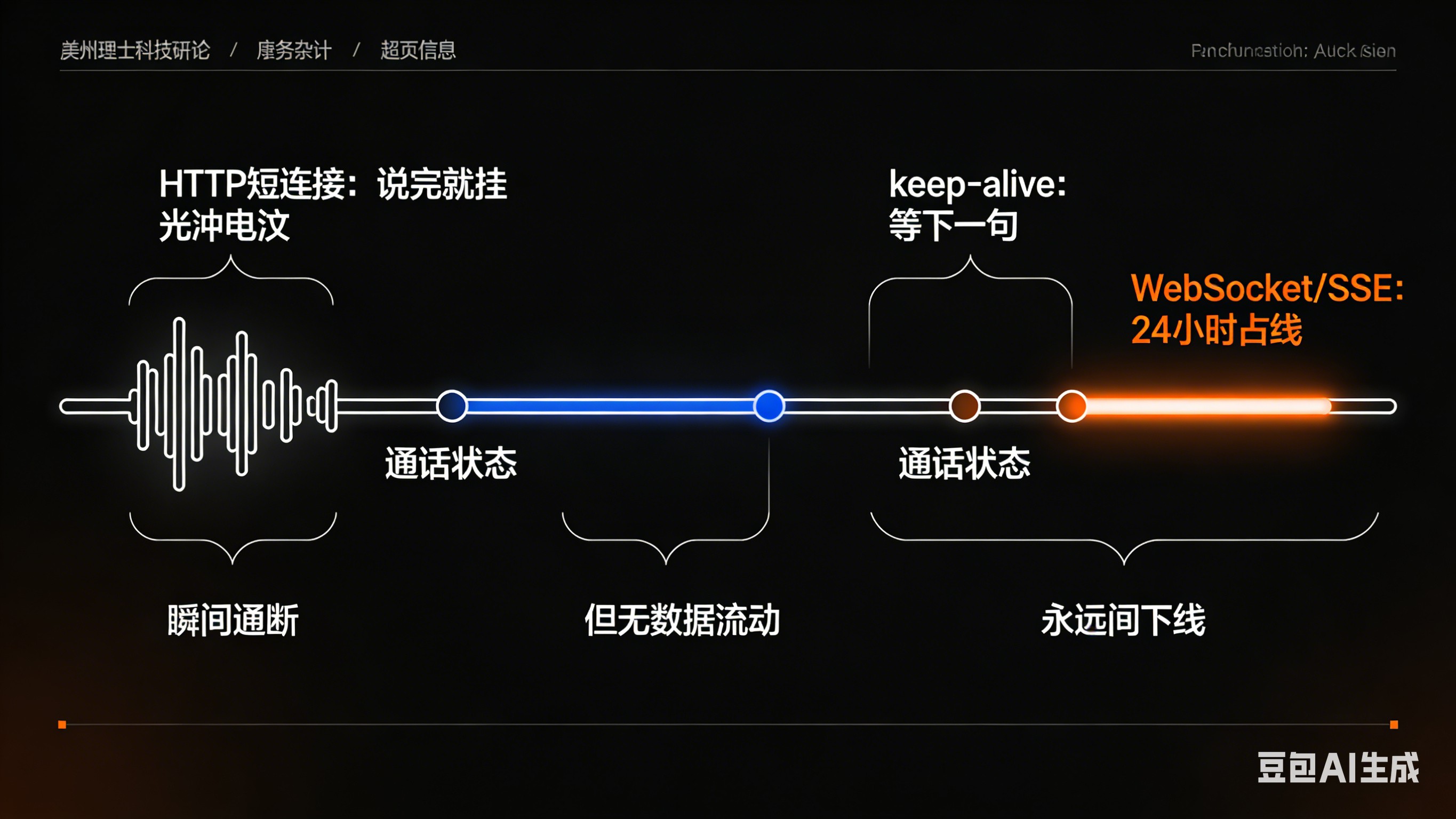 哪怕开了"说完不挂"模式(keep-alive),线还连着,但双方都知道这通电话已经说完了 ,只是等着你说下一句。