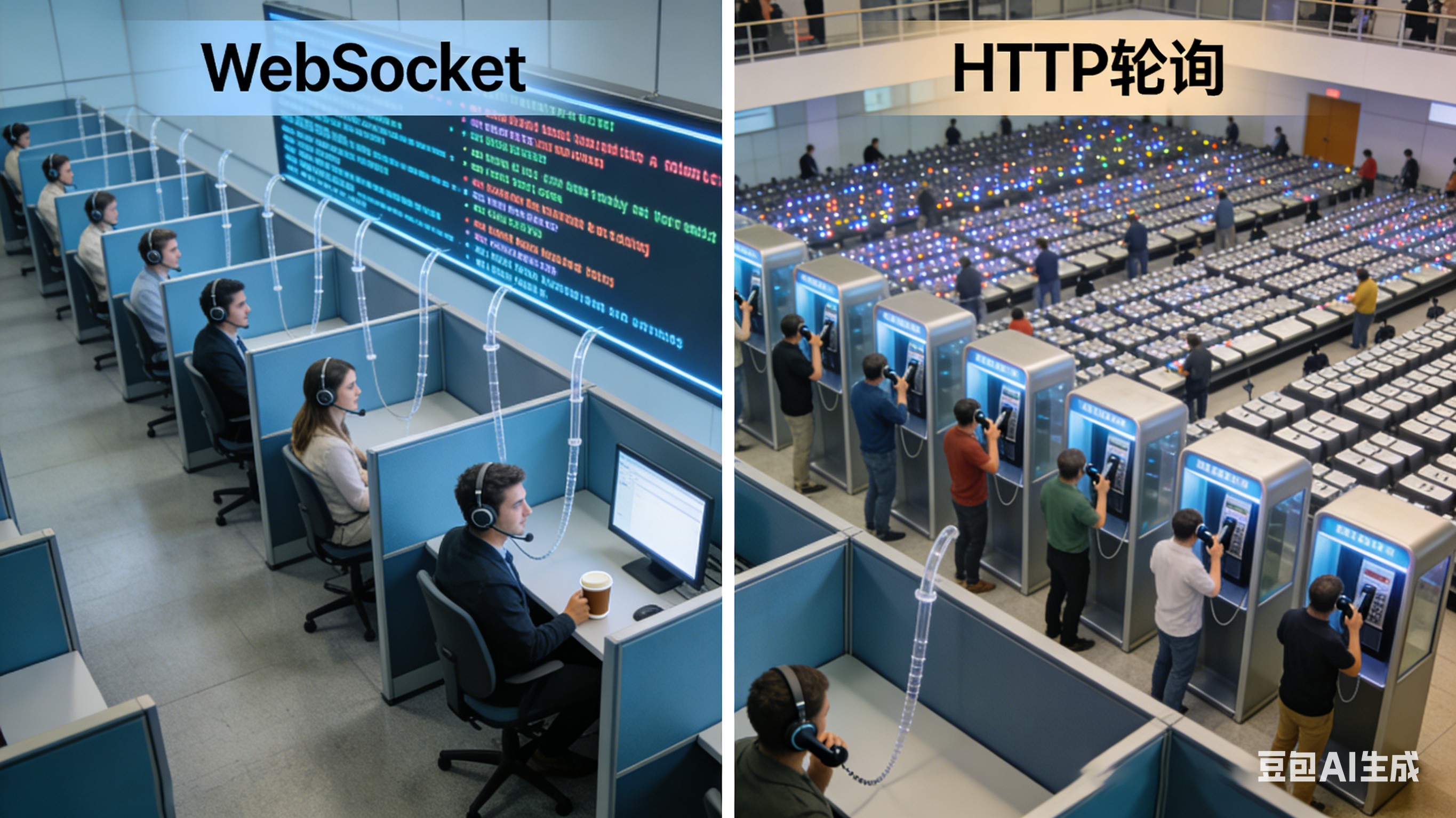 WebSocket 双向专线:每人只拨一次,线一直通着 。