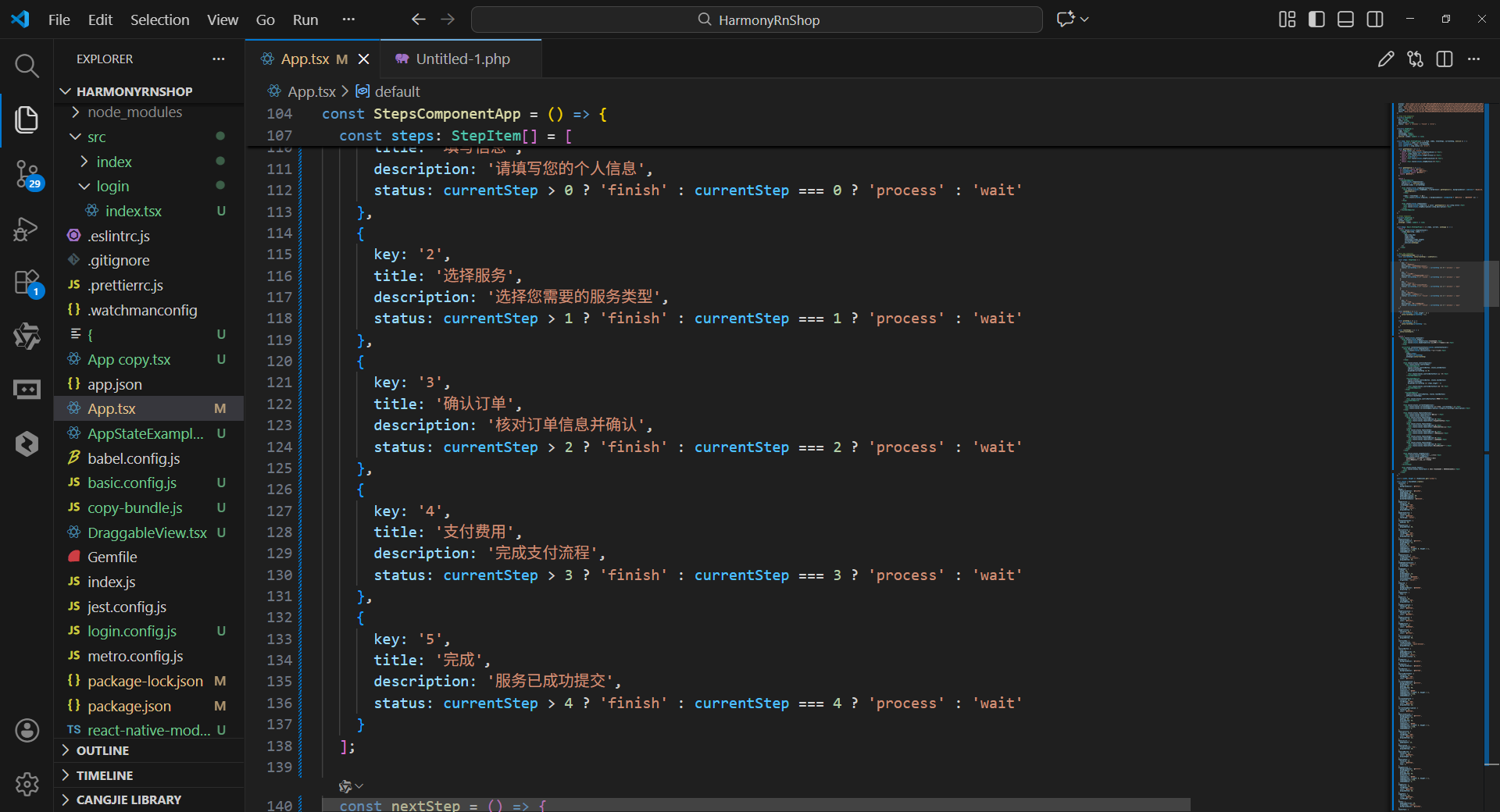 流程控制逻辑完全基于 React 状态管理(useState)实现,不依赖任何平台特定的API,这保证了在 React Native 与鸿蒙的不同集成方式下(如基于 ArkTS 的混合开发、纯 React Native 开发),业务逻辑都能无缝迁移。同时,步骤数据的定义采用 TypeScript 接口(StepItem)进行强类型约束,避免了跨端开发中因数据类型不一致导致的运行时错误,提升了代码的健壮性。