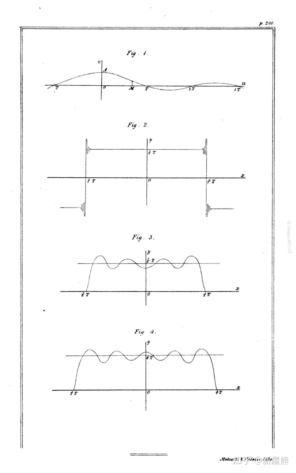 1807 年 12 月 21 日 ,傅里叶(Joseph Fourier)向法兰西科学院(Institut de France)提交题为《关于热在固体中的传播》(Mémoire sur la propagation de la chaleur dans les corps solides)的论文,首次系统提出:任意连续周期信号均可由一组适当的正弦曲线叠加表示。该观点遭到评审委员拉格朗日(Joseph-Louis Lagrange)的反对,未能通过审核。拉格朗日反对的理由是:傅里叶级数无法精确拟合具有棱角(即不连续点)的信号。