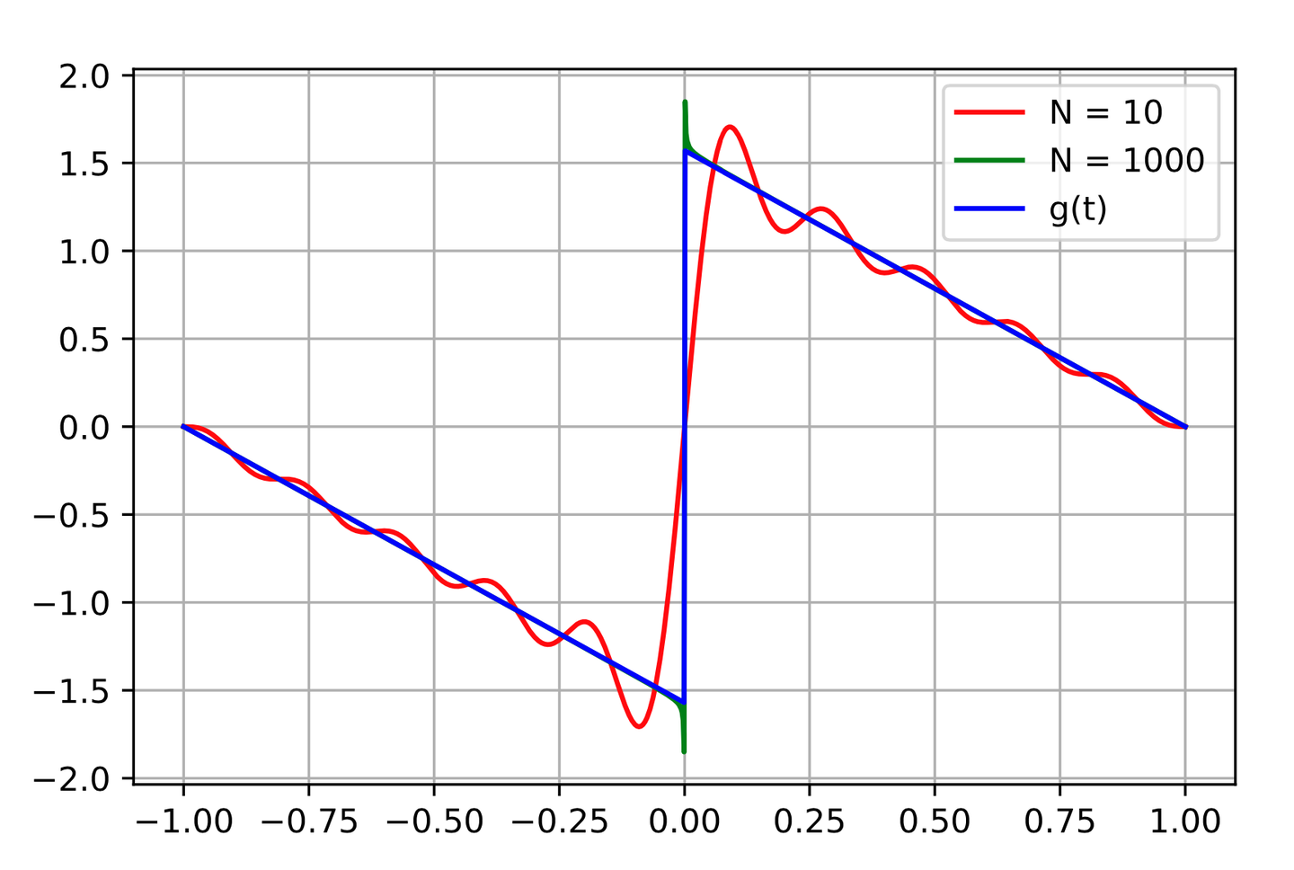 不连续波形并非仅包含方波,锯齿波也可属于不连续波形。对于锯齿波,其傅里叶级数同样会出现吉布斯现象,且过冲幅度仍为 8.9%。现以周期为 2 的锯齿波函数 g ( t ) g (t) g(t) 为例进行说明,该函数在区间 [ − 1 , 1 ] [-1, 1] [−1,1] 内的表达式为: