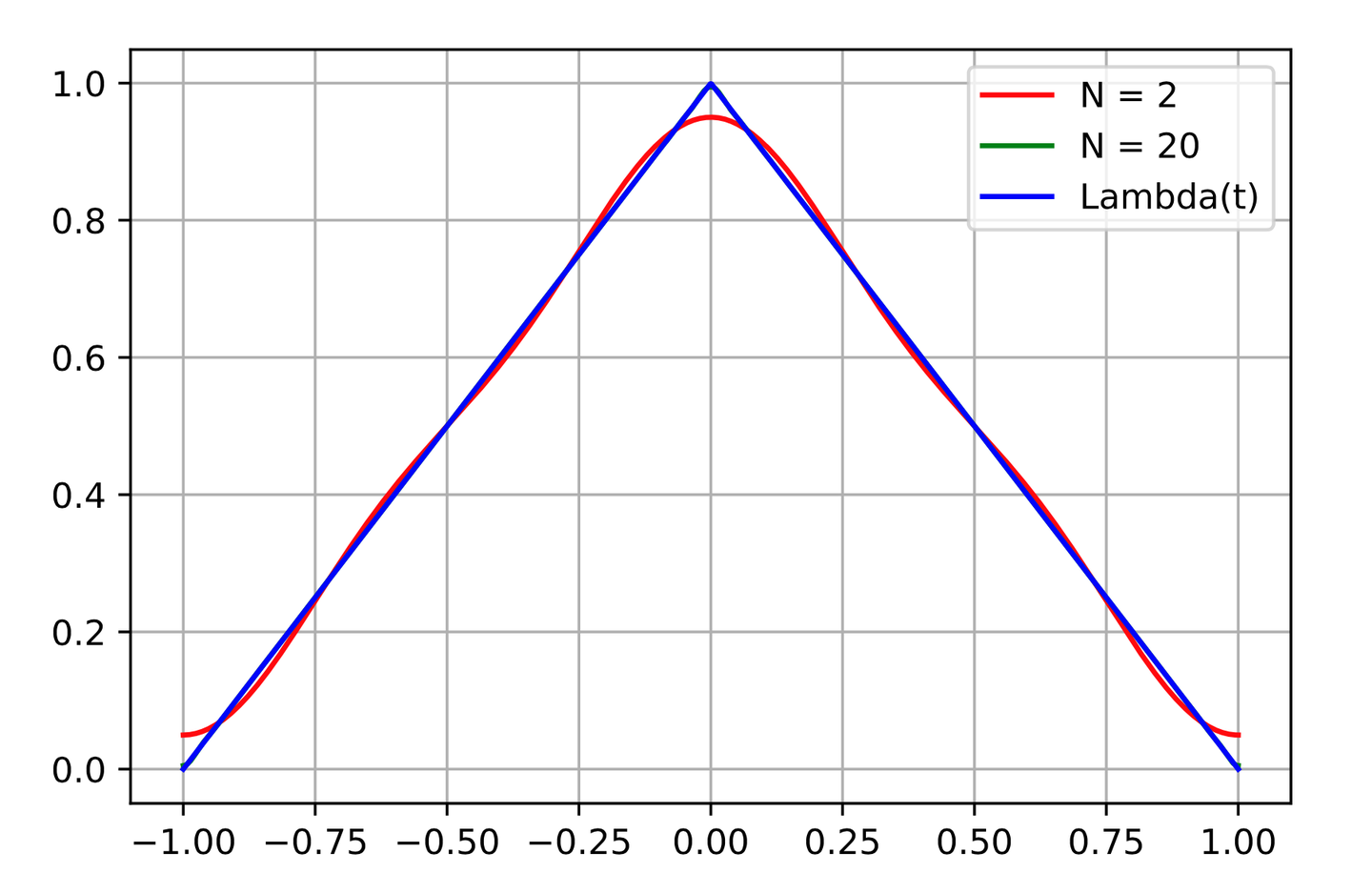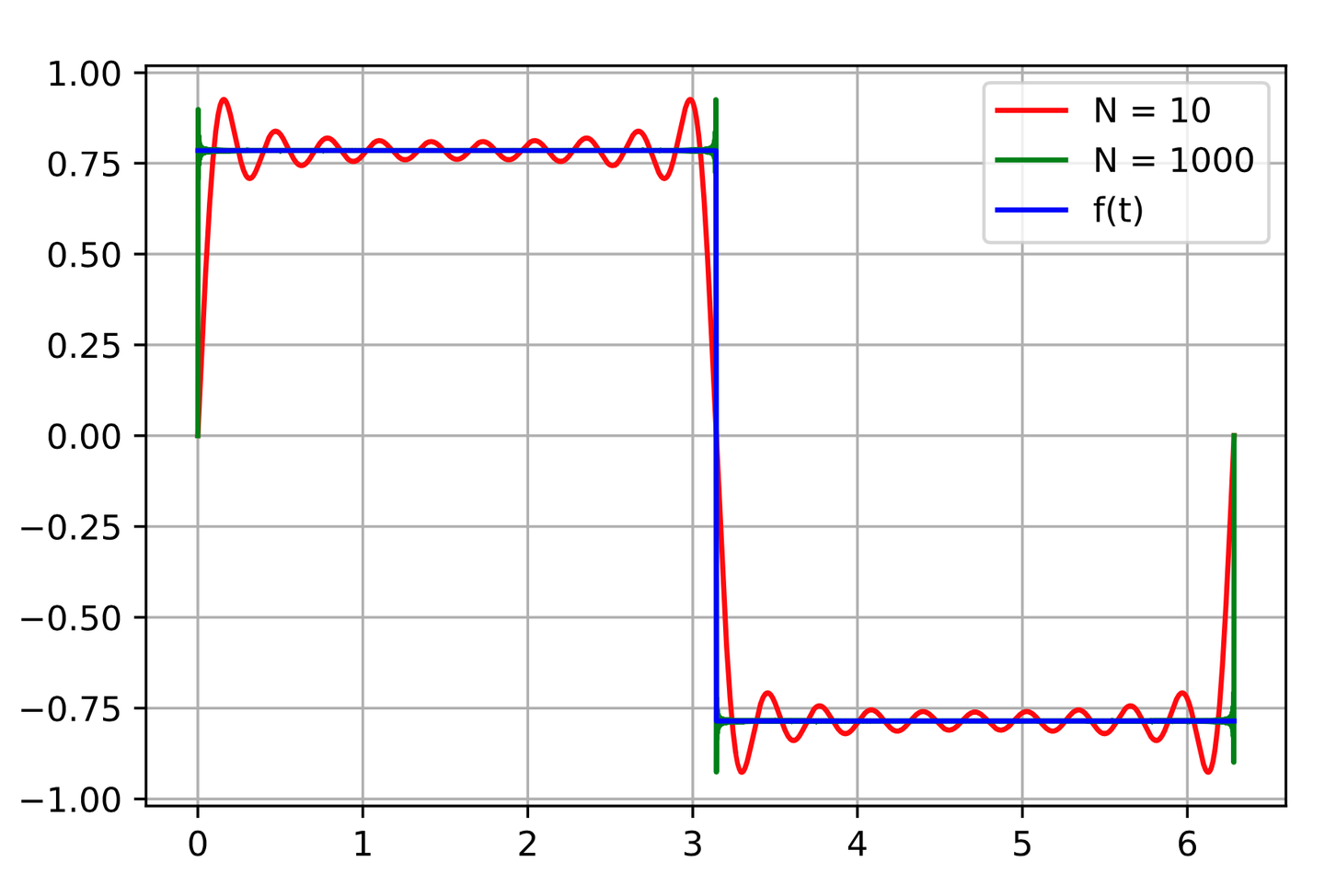 由图可知,有限项傅里叶级数在 t = 0 t = 0 t=0 附近存在过冲,增加 N N N 的取值无法消除该过冲,仅能使过冲点无限趋近于 0。只要函数存在间断点,其傅里叶级数就会出现过冲或下冲现象。