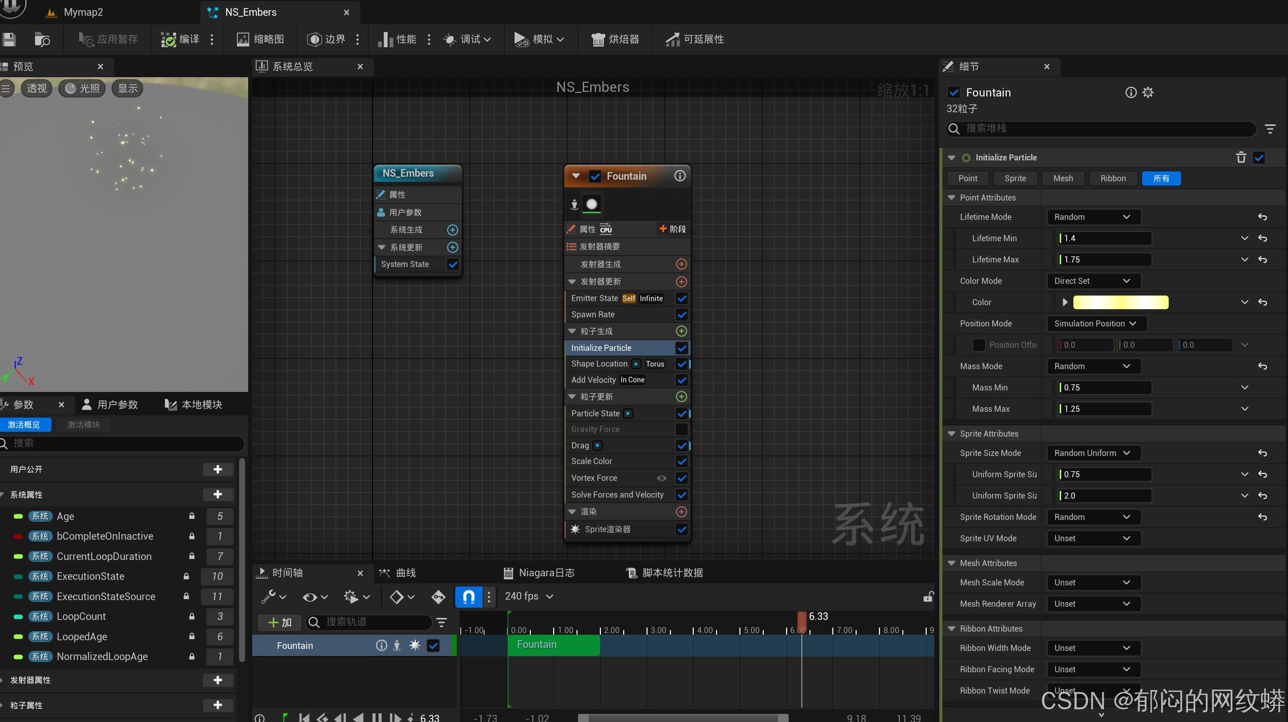 - 创建一个Niagara系统。了解Fountain的各个参数功能。