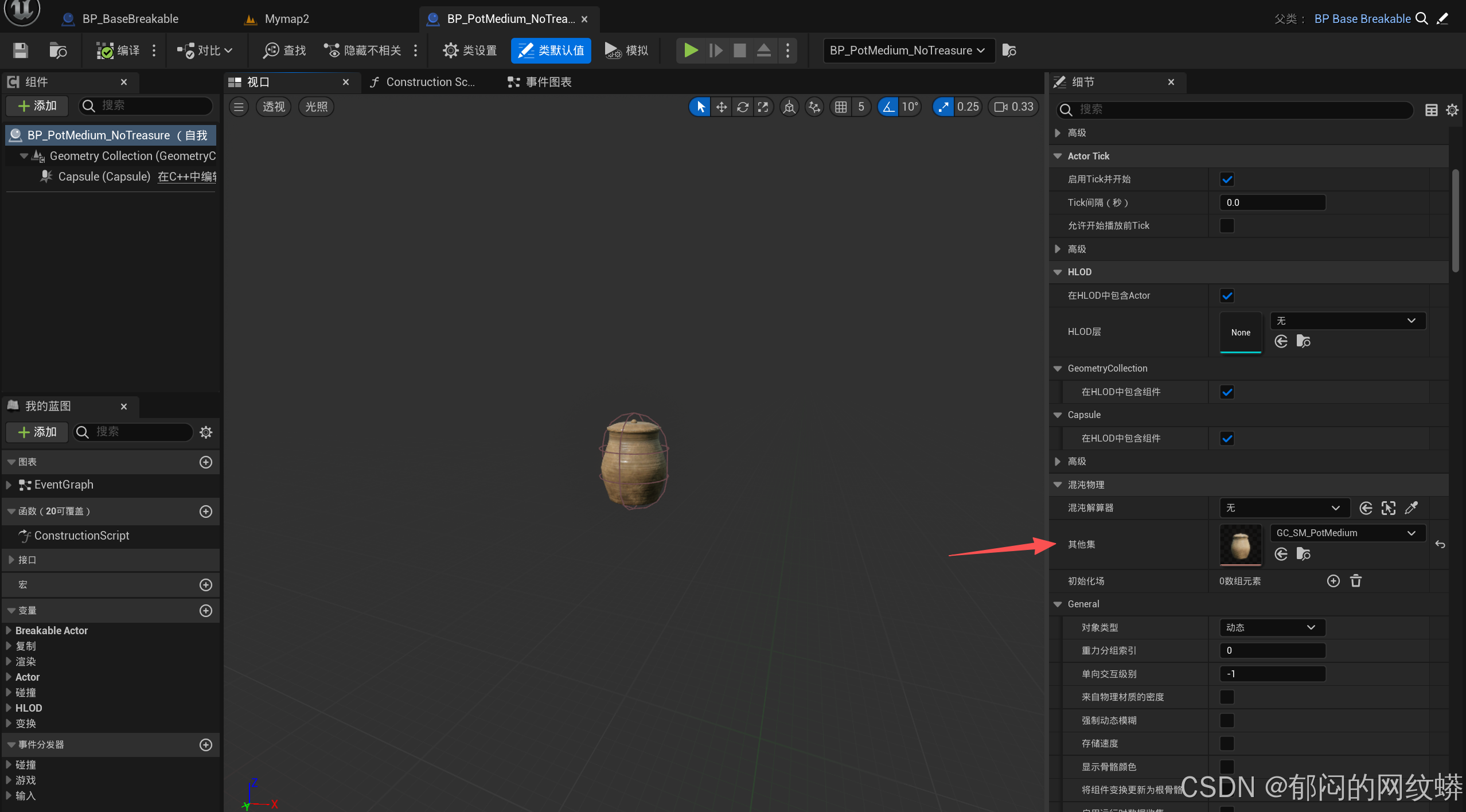 - 选择其它的容器资产,新建几何集合,碎裂它,再创建对应的子蓝图,设置好几何集合的类型,胶囊体,出来的宝藏类型。