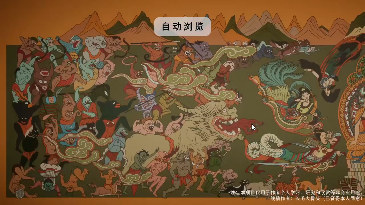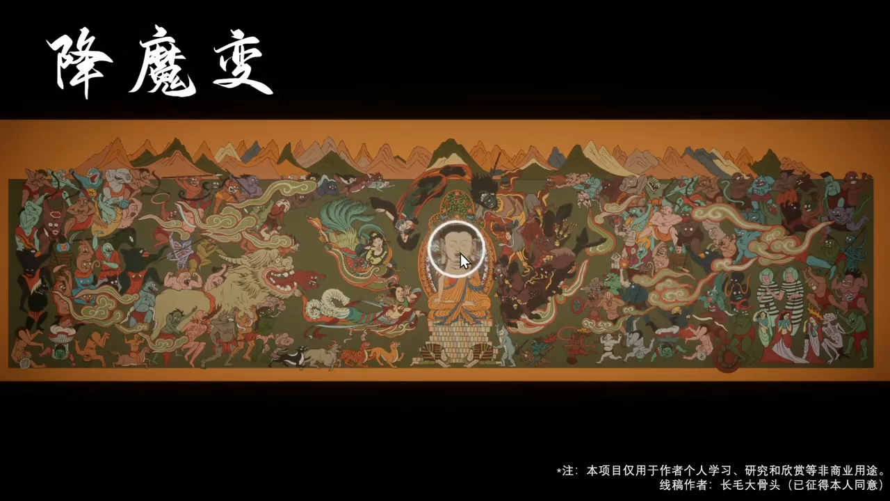 前年暑期,电视剧《唐朝诡事录之西行》播出,其中"降魔变"单元的成佛寺壁画令我印象深刻。后来在小红书上获得线稿,我在 Photoshop 中对照原图完成上色与还原。随后,我基于 Unity3D 的 HDRP 渲染管线进行展示开发,实现了放大镜细节查看与自动预览等功能。