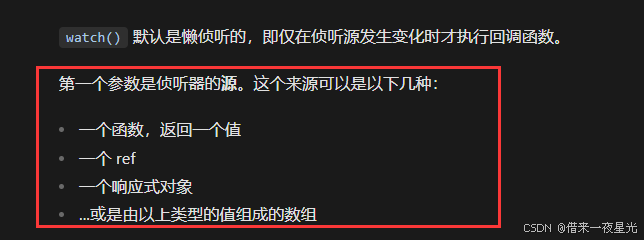 当监视响应式对象中的某个属性,且该属性是基本类型的,要写成函数式------也就是一开始所说的Vue3中点的watch只能监视的四种类型中的 函数返回一个值(getter函数)
