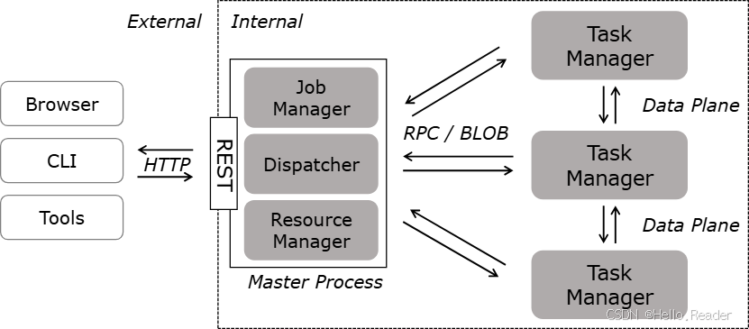 - 数据面:TaskManager ↔ TaskManager 的网络数据交换(shuffle/broadcast/redistribution)