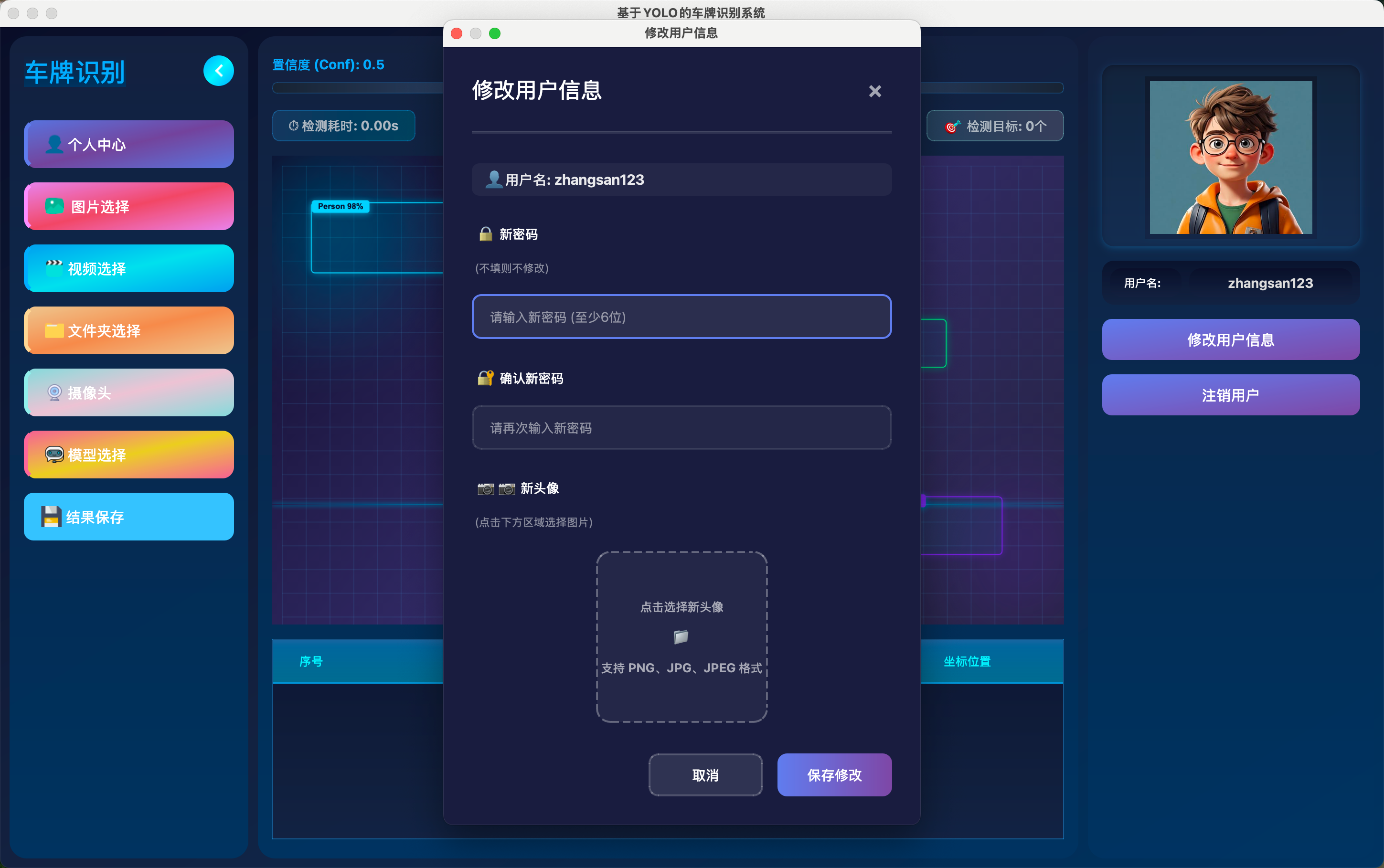 用户可在此模块中修改密码或更换头像,个人信息支持随时更新与保存。