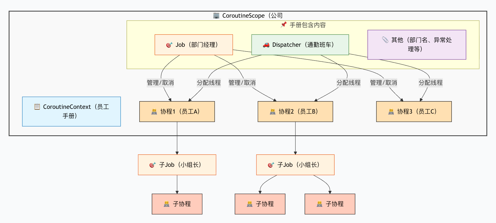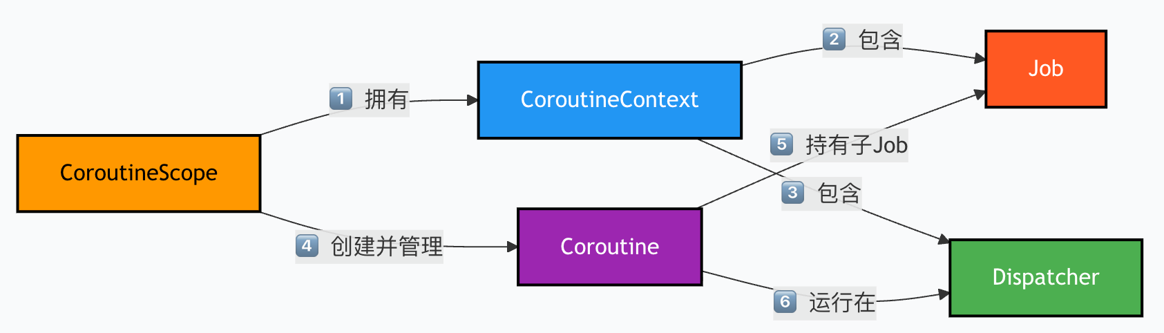 | 包含关系 | 持有 CoroutineContext | 被 CoroutineScope 持有 |