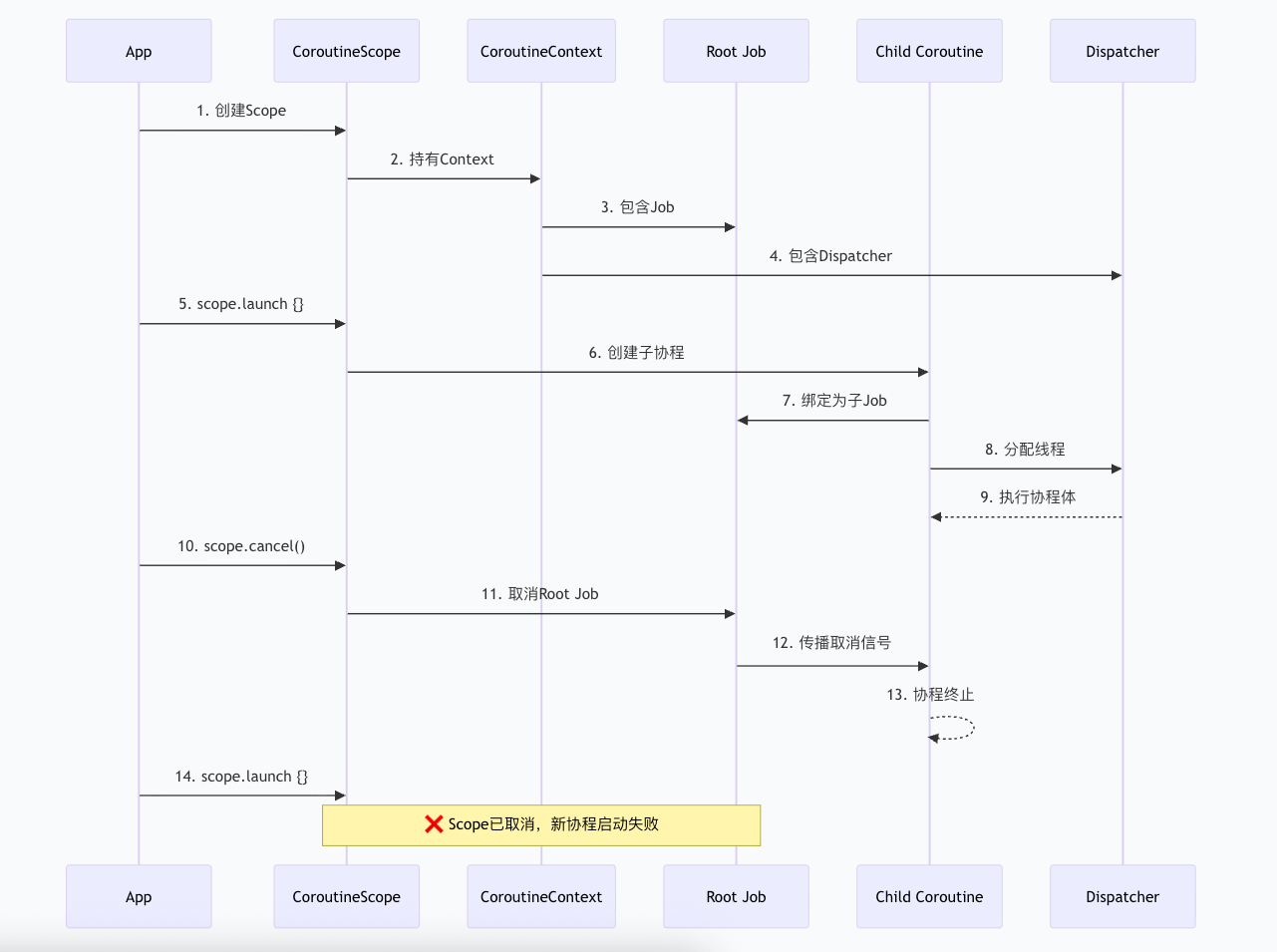 | 取消操作 | scope.cancel() → 取消所有子协程 |