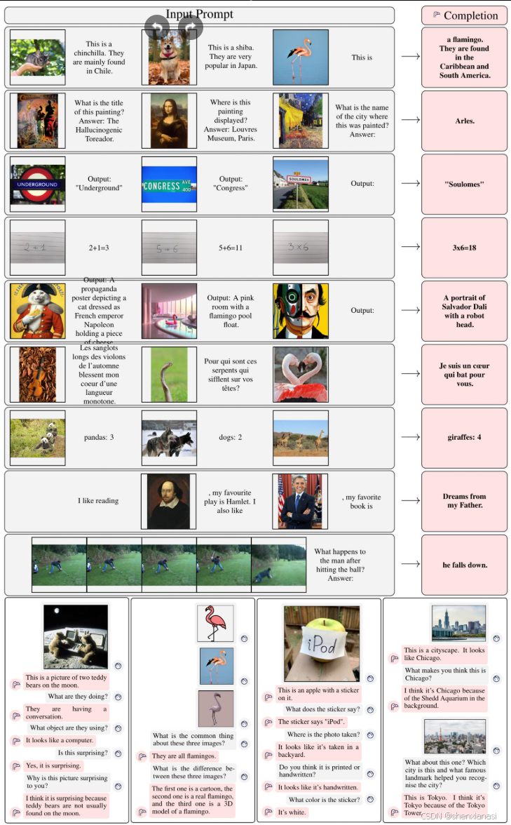 Flamingo-80B获得的输入和输出的精选示例。Flamingo可以通过少量样本提示快速适应各种图像/视频理解任务(顶部)。开箱即用,Flamingo还能够进行多图像视觉对话(底部)