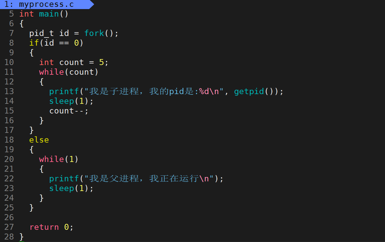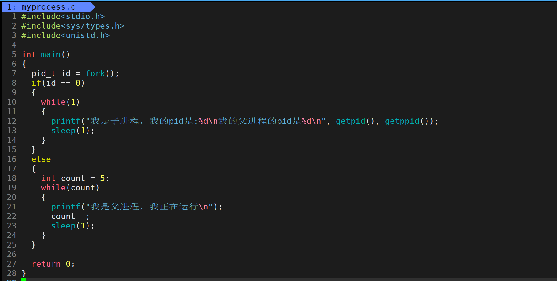 上面的代码,子进程会一直循环,父进程先循环5次,然后父进程结束退出。