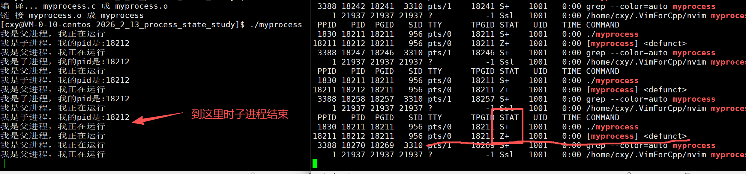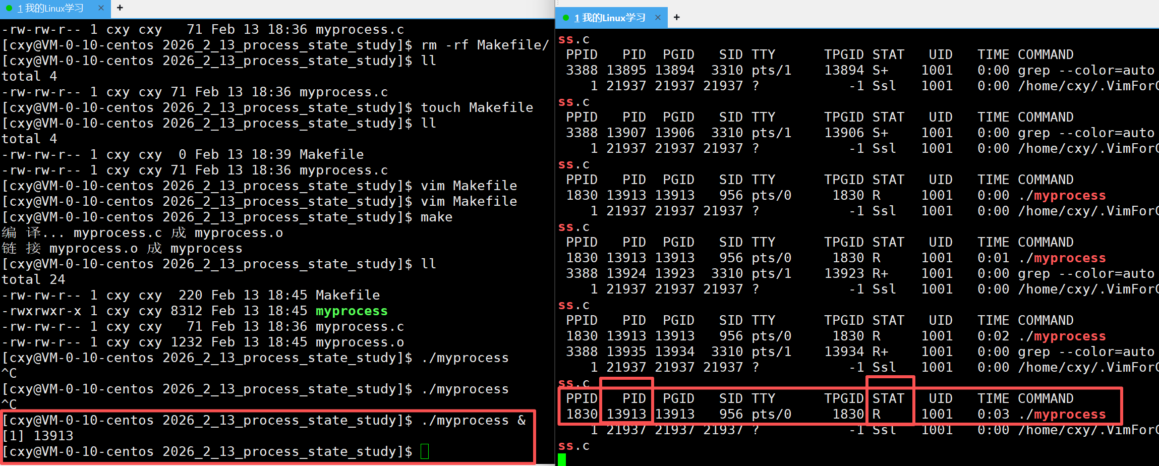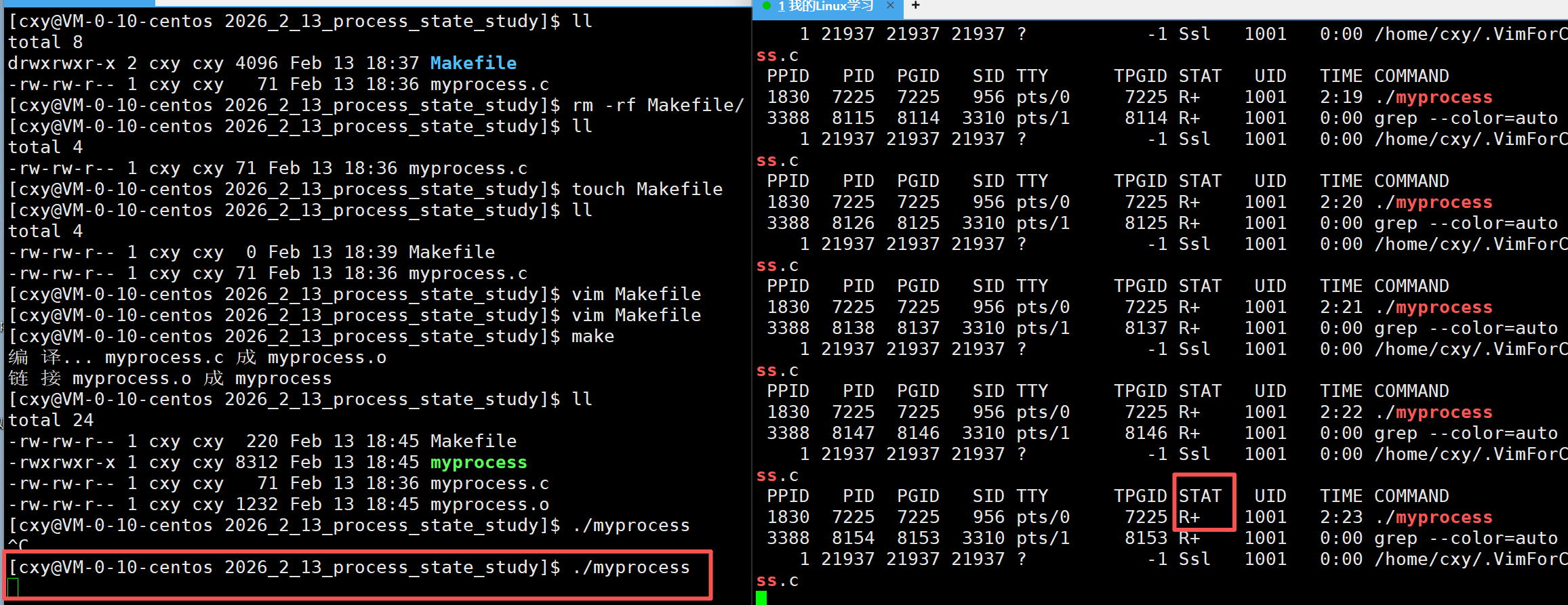 左边正一直在执行while循环,右边查看该进程发现该进程的状态是R。该进程是运行状态。
