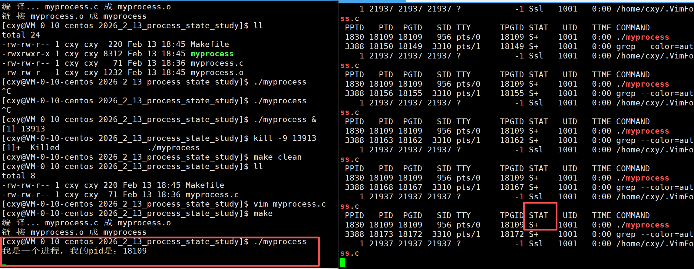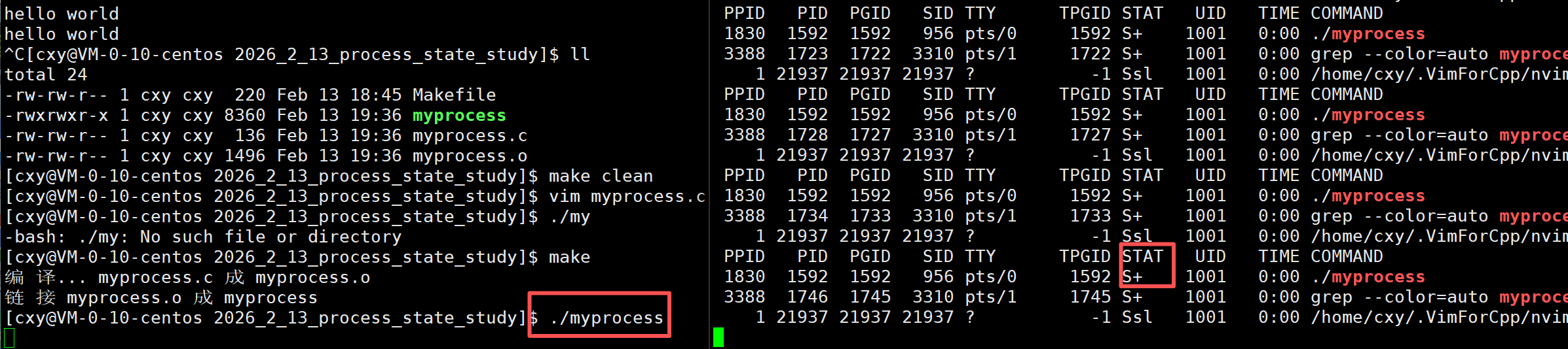 此时观察左边终端可以发现该进程在等待输入。观察右边终端发现该进程处于S状态。
