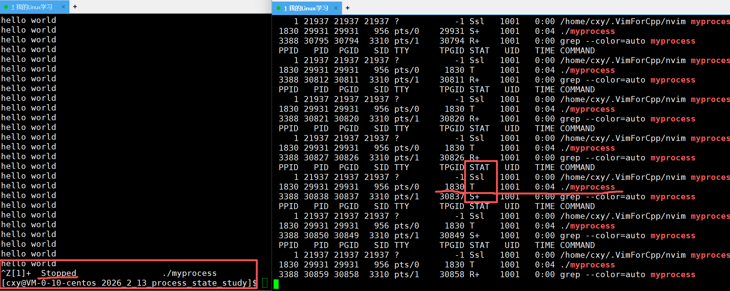 左边终端可以发现该进程被暂停,右边终端显示进程状态为T