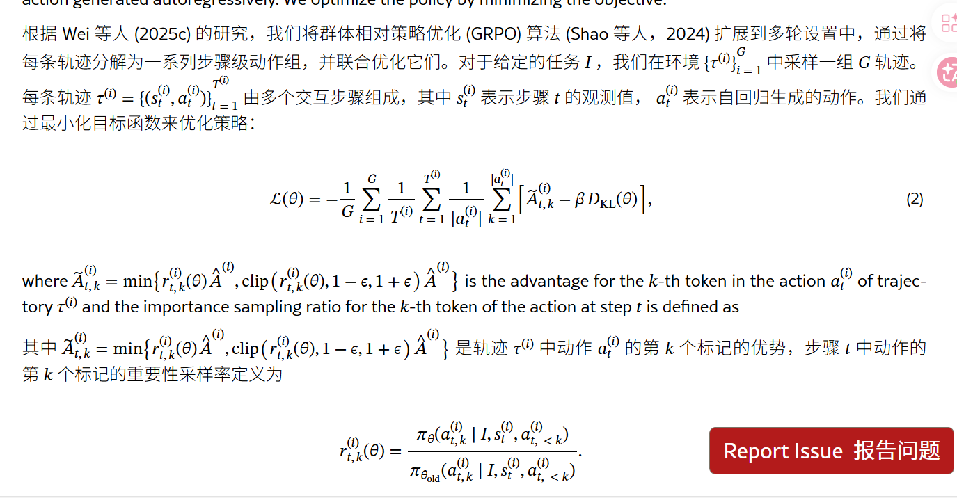 根据 Wei 等人 (2025c) 的研究,我们将群体相对策略优化 (GRPO) 算法 (Shao 等人,2024) 扩展到多轮设置中,通过将每条轨迹分解为一系列步骤级动作组,并联合优化它们。对于给定的任务 I ,我们在环境 {τ(i)}i=1G 中采样一组 G 轨迹。每条轨迹 τ(i)={(st(i),at(i))}t=1T(i) 由多个交互步骤组成,其中 st(i) 表示步骤 t 的观测值, at(i) 表示自回归生成的动作。我们通过最小化目标函数来优化策略
