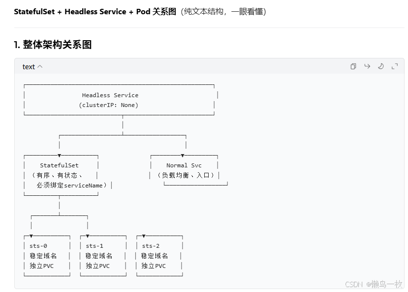 StatefulSet 必须依赖一个固定的 Service(Headless Service)才能工作。这个 Service 不是用来负载均衡,而是给 Pod 提供稳定的网络标识与域名解析。